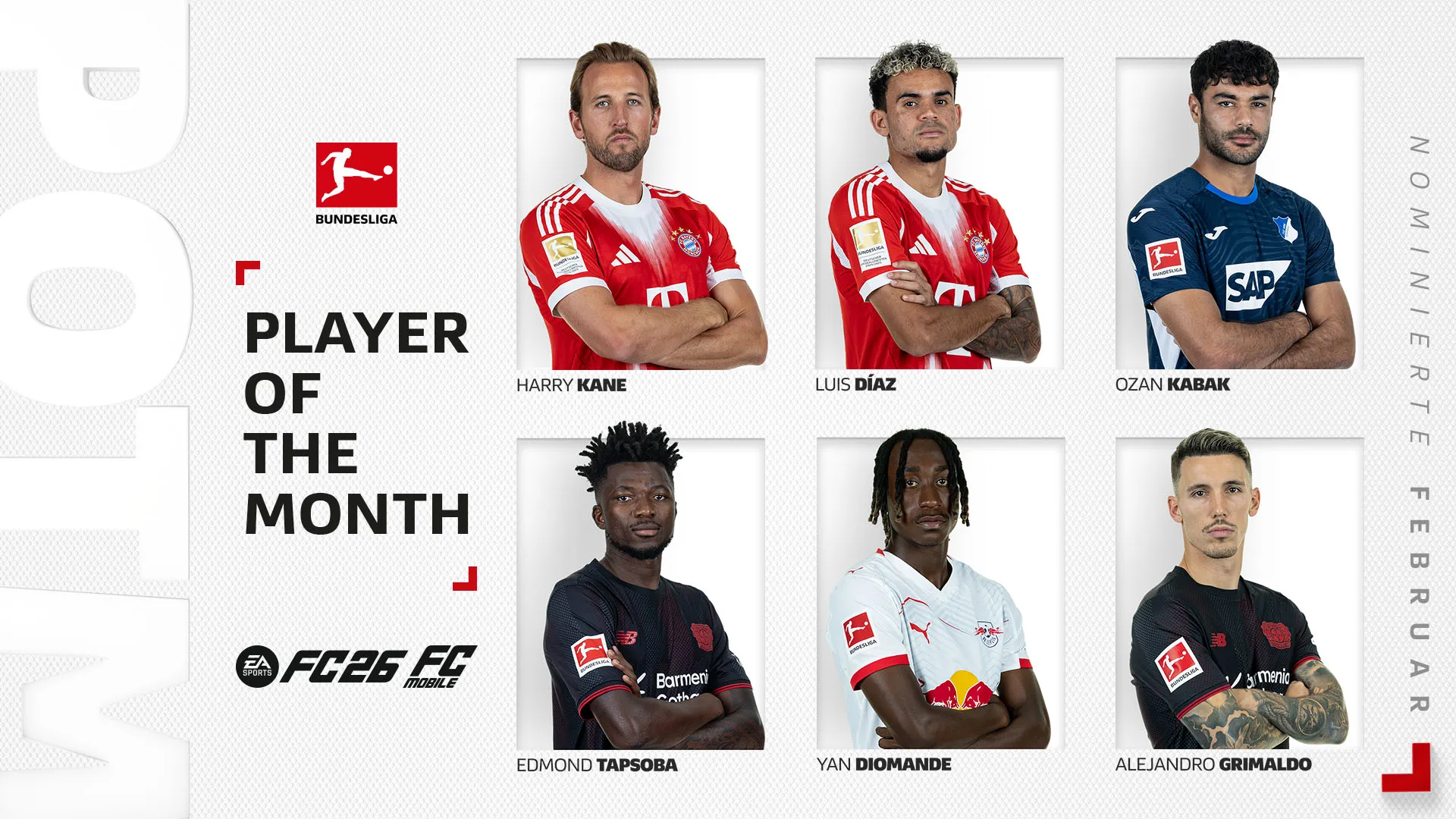 虎扑03月04日讯 德甲官方公布联赛2月最佳球员候选,凯恩、路易斯-迪亚斯、迪奥曼德等6名球员在列。